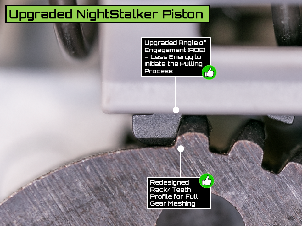 Once the Nightstalker Piston is installed, the sector gear will be perfectly positioned to begin pulling the piston in the most energy efficient and reduced force that will be applied onto the first pick-up tooth. As a result you can expect a much snappier trigger response!